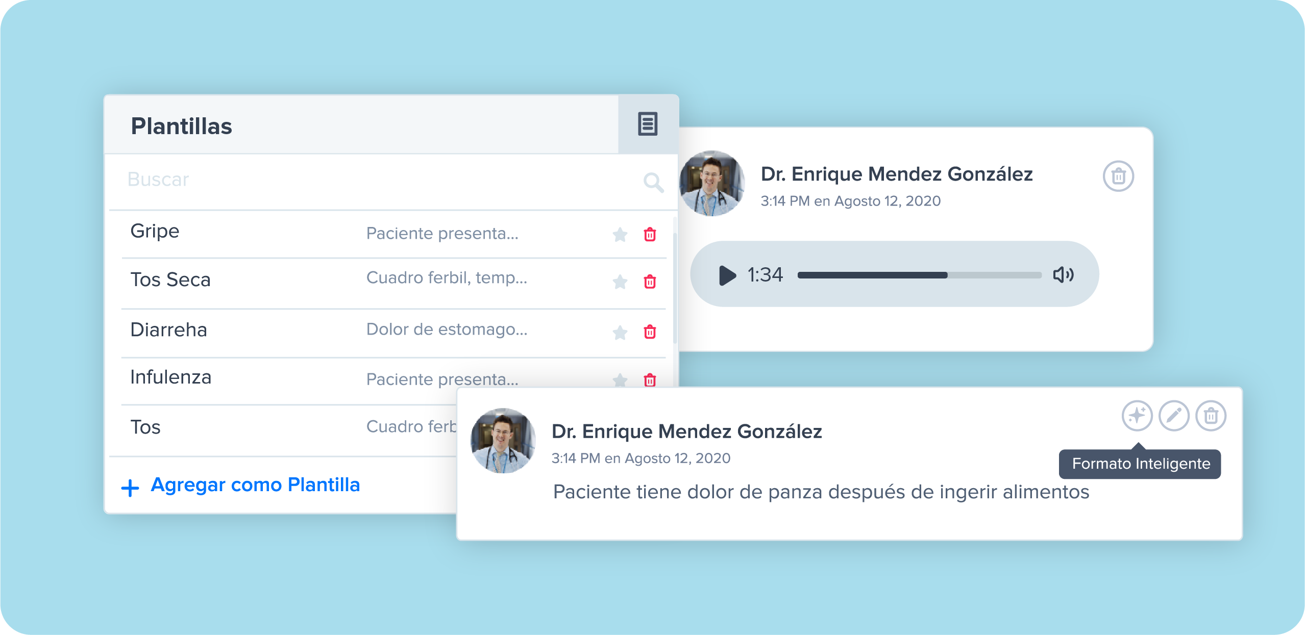 ¿Por qué redactar desde cero lo mismo una y otra vez? Con plantillas personalizables, puedes guardar tus notas más usadas y cargarlas con un clic. Si necesitas recopilar información de manera estructurada, convierte tus plantillas en cuestionarios para que pacientes o personal de apoyo completen los datos necesarios. Cada profesional de tu clínica puede contar con sus propias plantillas o compartirlas a nivel organizacional para mantener un estándar uniforme.