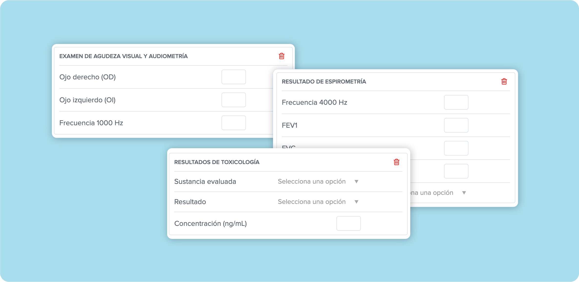 Algunos clientes ya están construyendo formularios como: Examen de Agudeza Visual y Audiometría, Resultado de Espirometría, Resultado de Transaminasas, Resultados de Toxicología, y más.